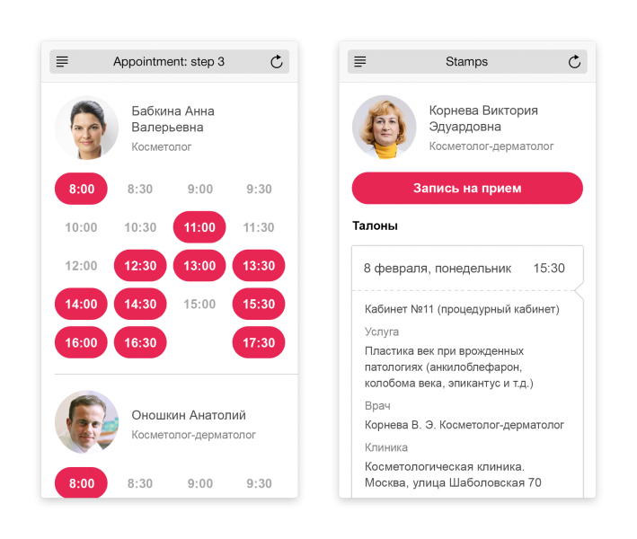 - расписание нескольких врачей на одном экране;